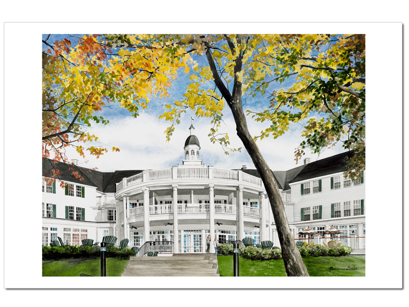 The Sagamore's grand and spacious lakeside veranda on an autumn afternoon.